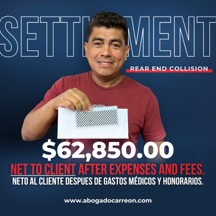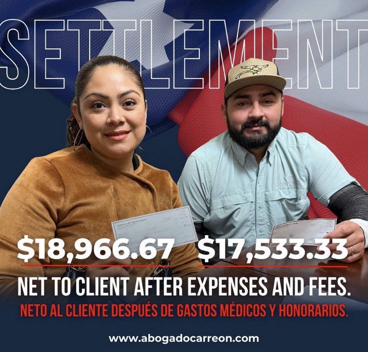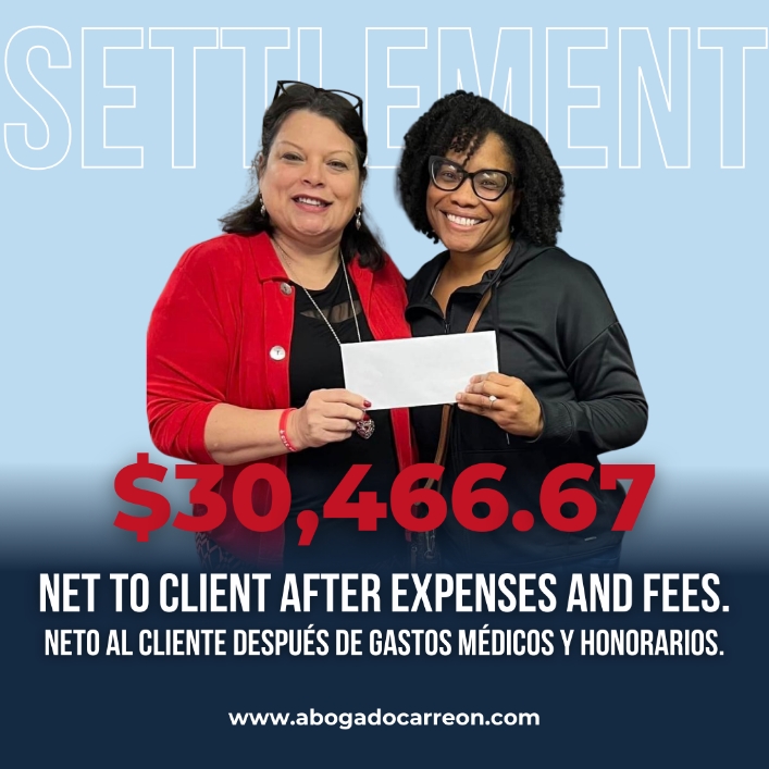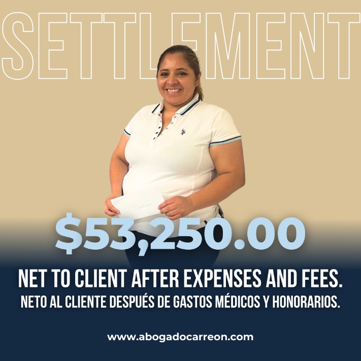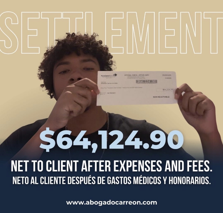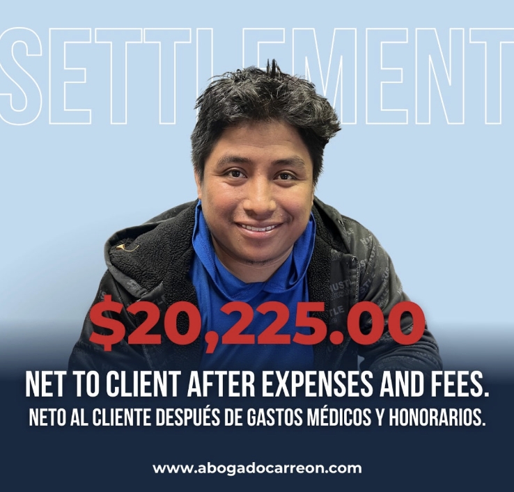 Cada foto de aquí representa más que un simple acuerdo—representa a un cliente que obtuvo la justicia que merecía. En el bufete de abogados Carreón, luchamos por las víctimas de lesiones porque sabemos el impacto que un accidente puede tener en sus vidas, sus familias y su futuro. Estas victorias son una prueba de que cuando tiene el equipo legal adecuado a su lado, puede enfrentarse a las compañías de seguros , las partes negligentes y ganar. Estamos orgullosos de haber ayudado a tantos clientes a asegurar la compensación que necesitan para seguir adelante. Si usted ha sido lesionado y no sabe a dónde acudir, estamos aquí para ayudar. Contáctenos hoy para una consulta gratuita y permitirnos comenzar a construir su historia de éxito.